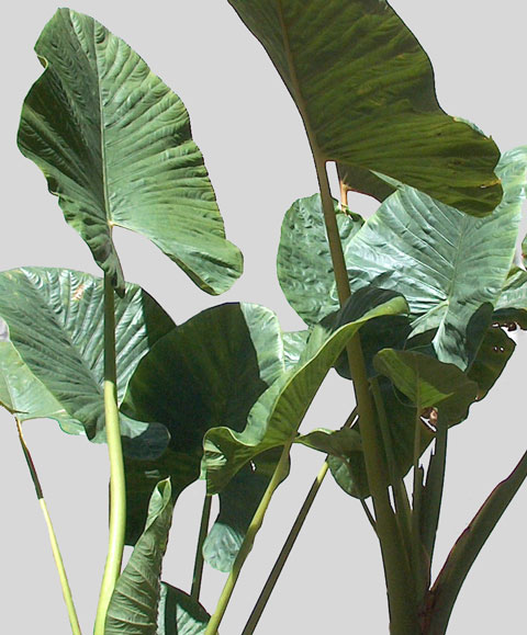 The veination on the leaves is distinctively prominent such that the veins can be felt easily on both upper and lower surfaces when running fingers across the leaf. The overall substance of the leaves is heavier than that of the Alocasia odora, macrorrhizos, or gageana.